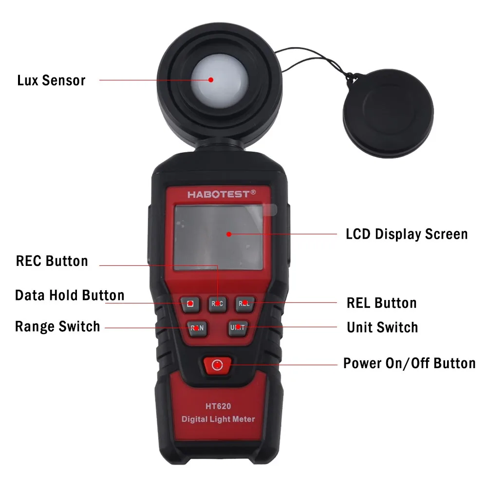 Range: 1000/10000/100000 LUX Accuracy: ±(3%+5); 100/1000/10000 FC Accuracy: ±(3%+5)