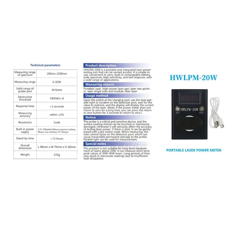 1Set HWLPM-20W 200Nm – 2200Nm Power Meter Portable Mini Power Meter Metal+Plastic