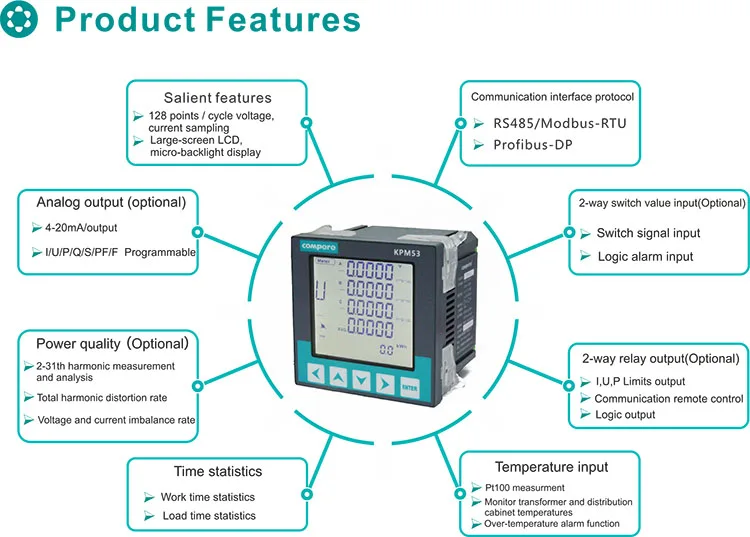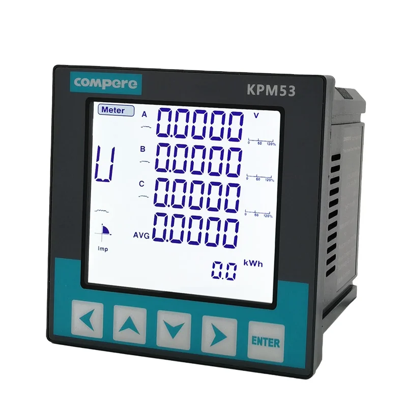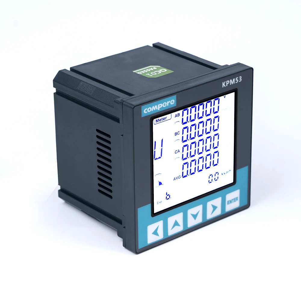 KPM53 series 3 phase RS485 programmable power quality analyzer digital monitoring electric energy power meter is used to monitoring three-phase voltage, current, power, power factor, frequency, etc. electrical parameters with LCD display, power statistics, power quality analysis, digital input/Output and network communications in one.