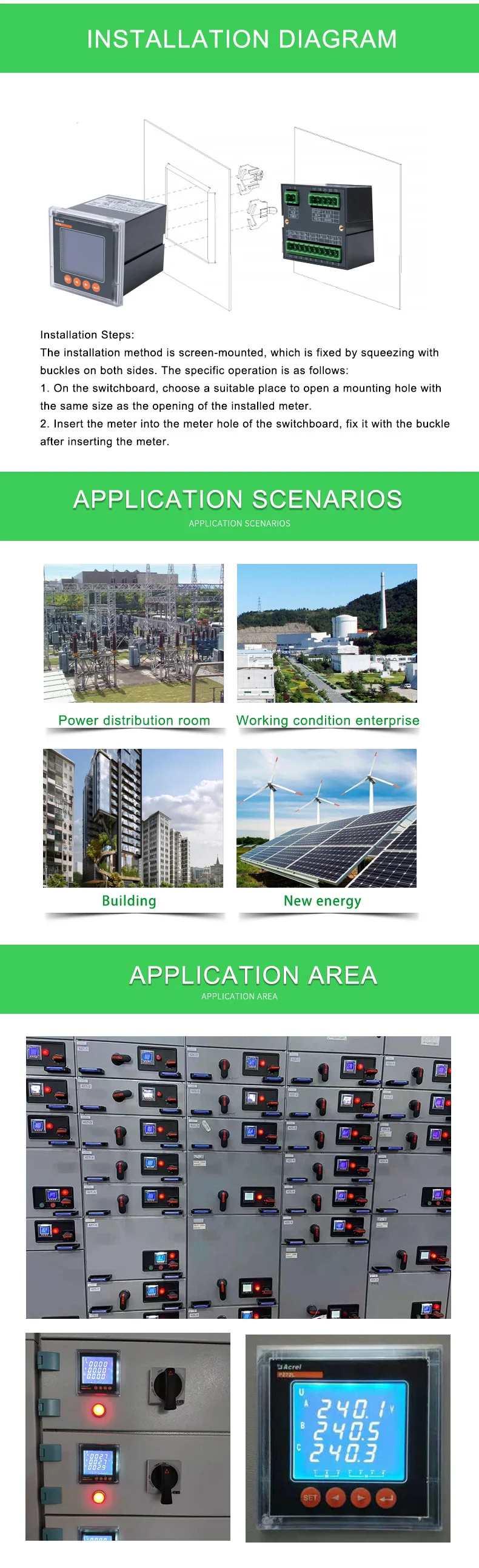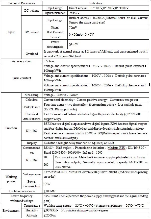 PZ series intelligent DC energy meter is designed for applications such as DC panels, solar power, telecommunications base stations, and charging posts. This series of instruments can measure voltage, current, power, forward and reverse power in DC system. It can be used for local display, and connected with industrial control equipment, computers, form a measurement and control system. And it has a variety of external excuse functions for the user to choose: RS485 communication interface, Modbus-RTU protocol, relay alarm output, digital input/output. According to different requirements, through the instrument panel keys, you can set the ratio, communication parameters.