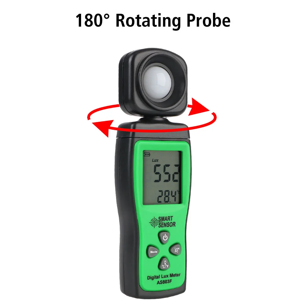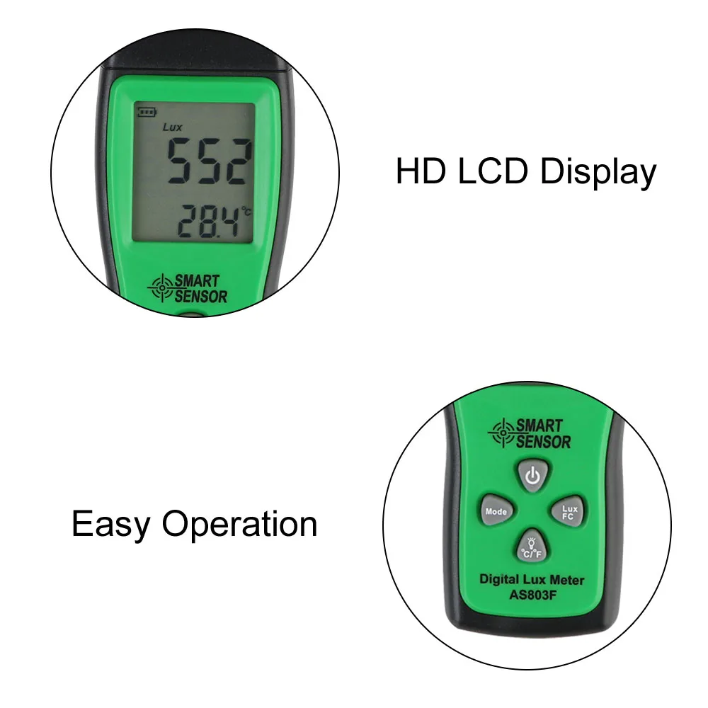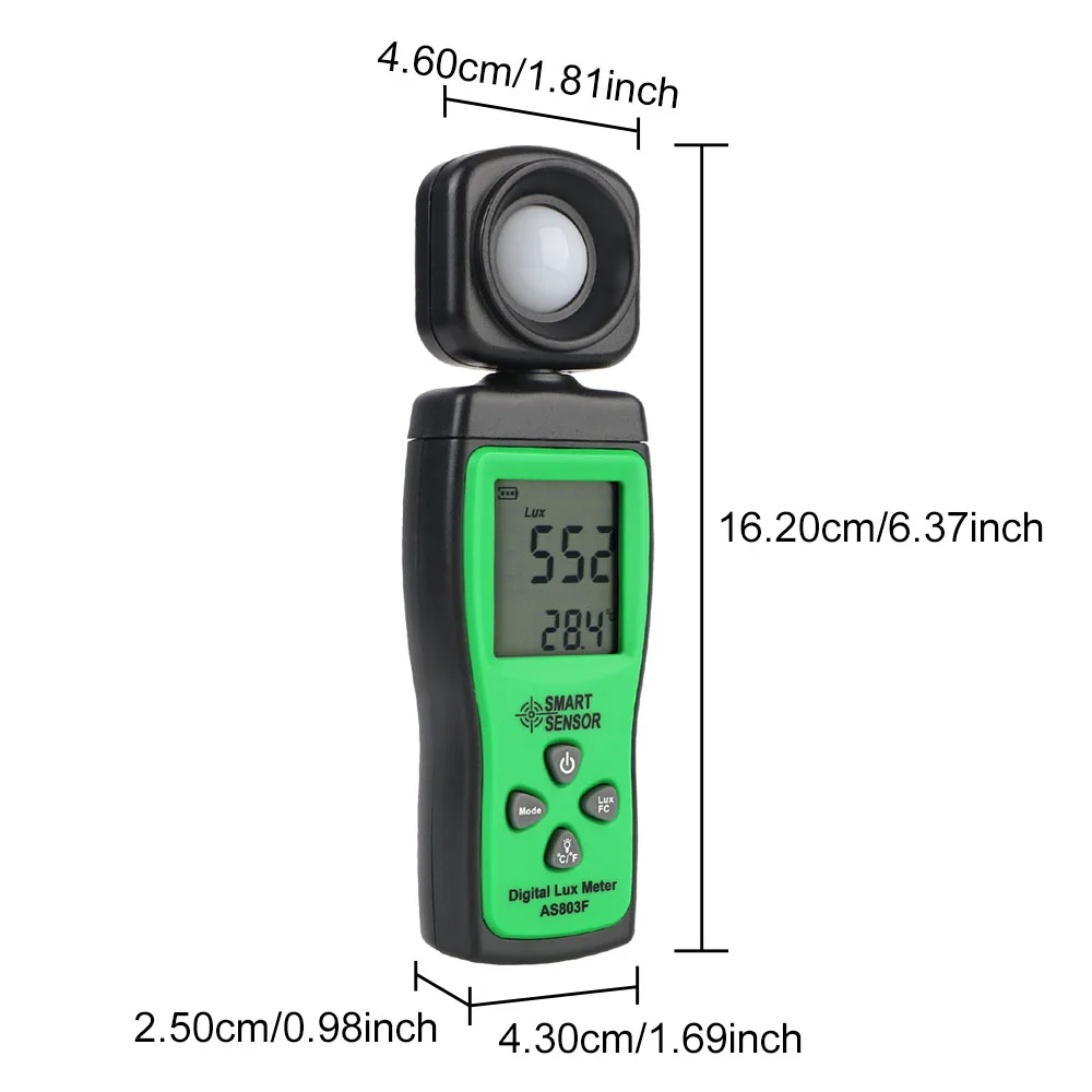 This practical mini lux meter is stable, safe and reliable to measure light illuminance, it also can show you the ambient temperature. It is widely used in lamps, husbandry, industrial and mineral industries, laboratory and office, etc.