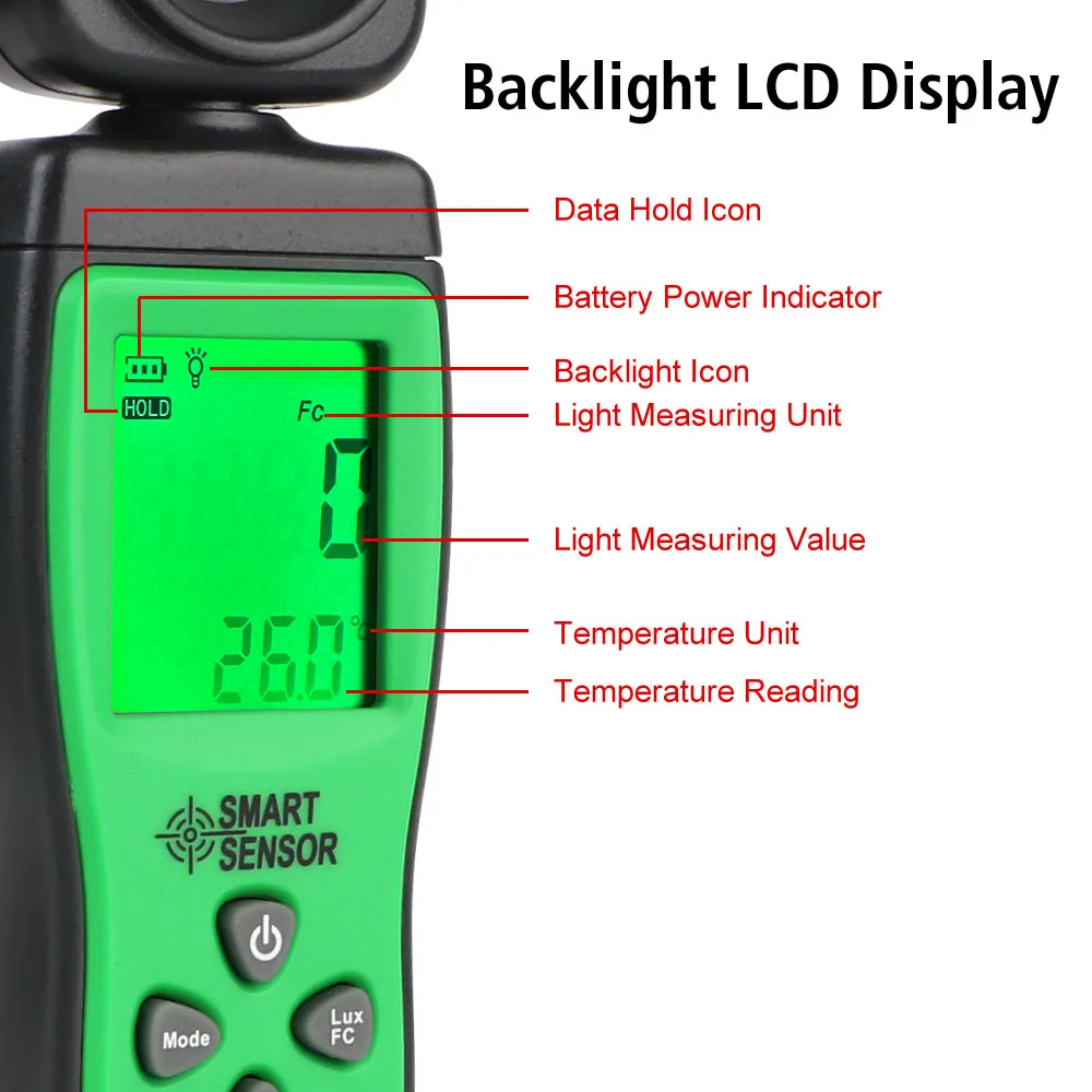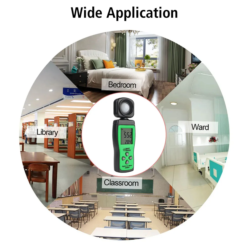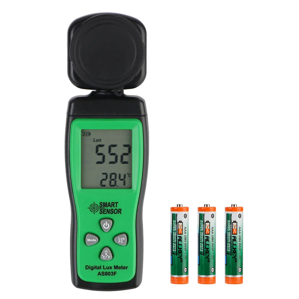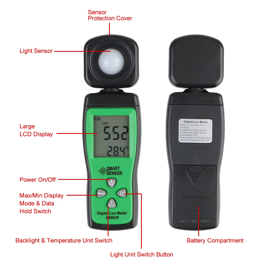 This practical mini lux meter is stable, safe and reliable to measure light illuminance, it also can show you the ambient temperature. It is widely used in lamps, husbandry, industrial and mineral industries, laboratory and office, etc.