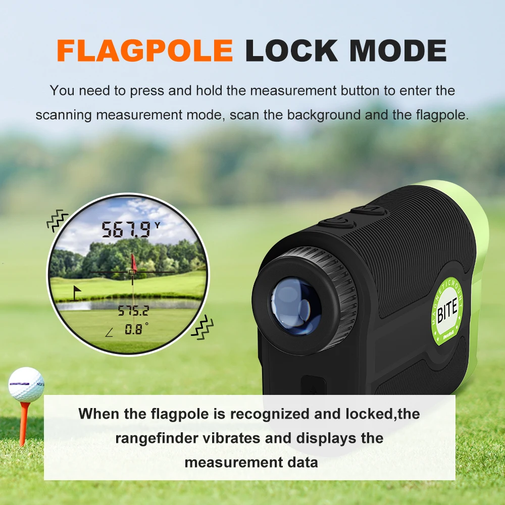 5.Lightweight and Portable: The weight of rangefinder is only 177g/6.24ounce. Golf range finder has strong magnetic strip, can be attached to the golf cart, convenient to carry.