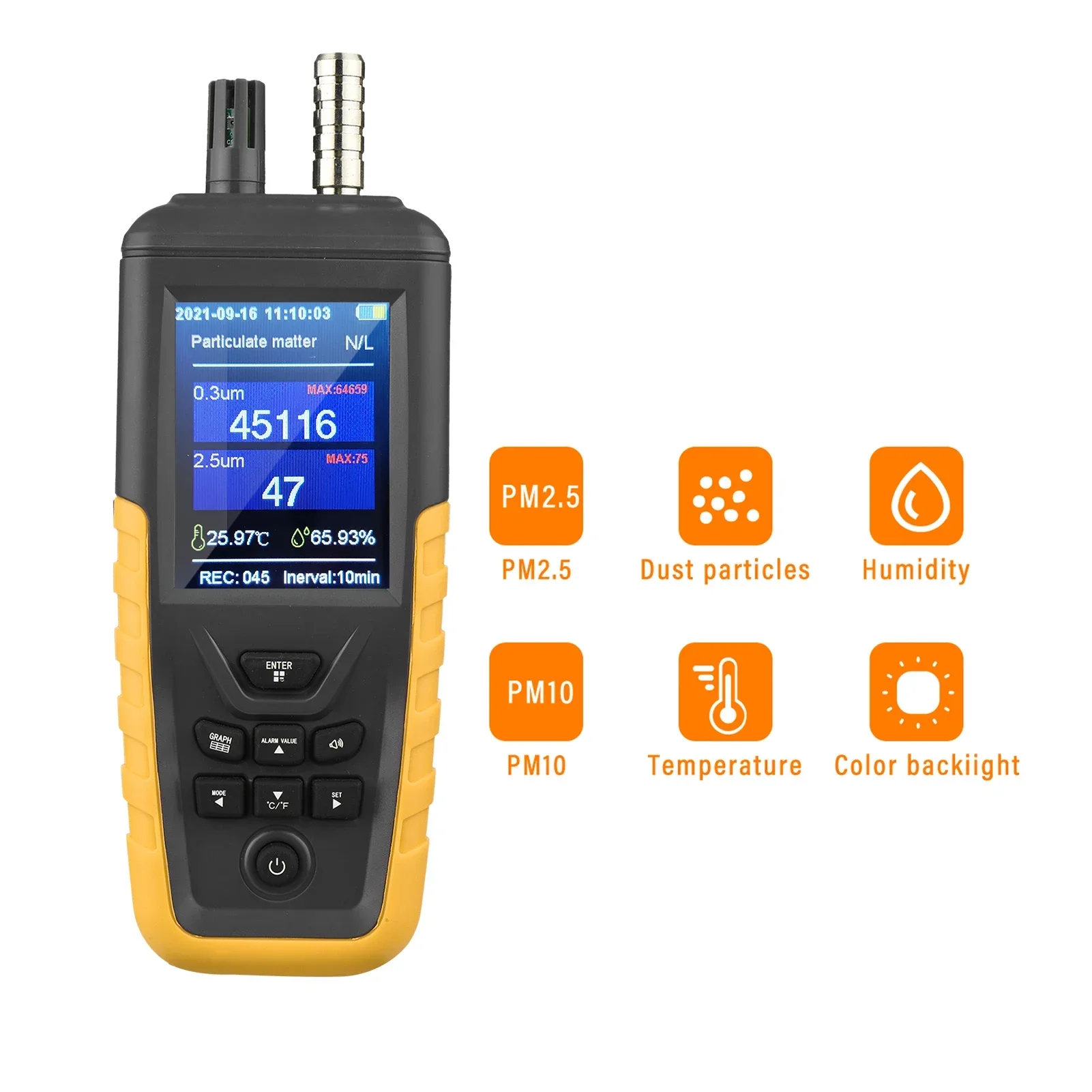 Data Record, Curve Graph & PM2.5 Alarm: It has 999 groups of data records, and you can view the data curve conveniently by pressing the graph button once. With PM2.5 alarm function, turn on/ off alarm buzzer and set the alarm value easily.