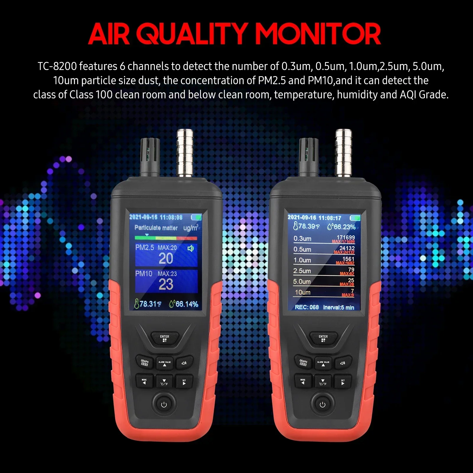 Air Quality Monitor: There are 2 models for option. TC-8100 features 3 channels to detect the number of 0.3um, 2.5um particle size dust, the concentration of PM2.5 and PM10, AQI Grade, temperature and humidity. TC-8200 features 6 channels to detect the number of 0.3um, 0.5um, 1.0um, 2.5um, 5.0um, 10um particle size dust, the concentration of PM2.5 and PM10, and it can detect the class of Class 100 clean room and below clean room, temperature, humidity and AQI Grade.